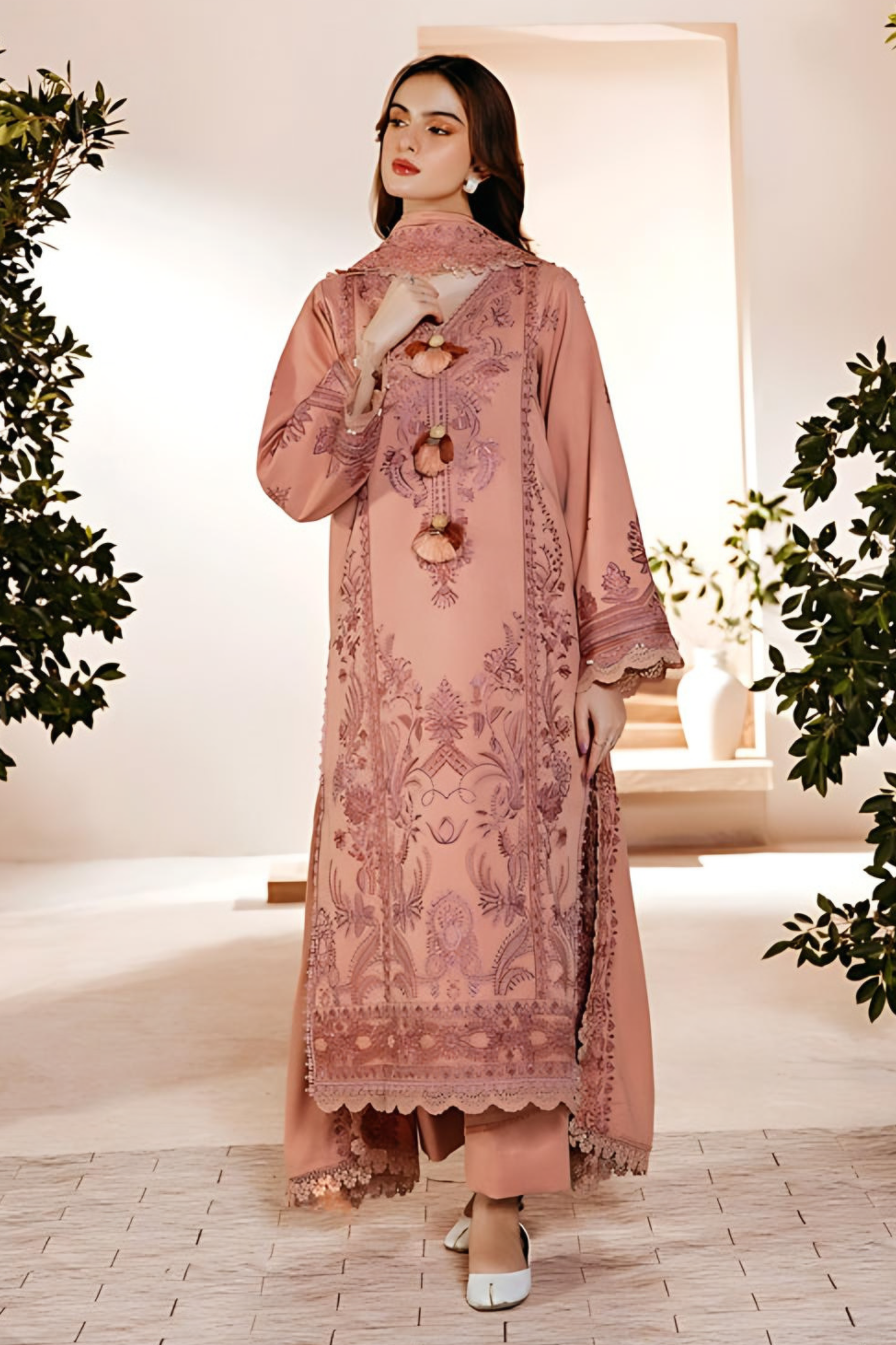 FLORENT - 3PC DHANAK EMBROIDERED SHIRT WITH DHANAK EMBROIDERED SHAWL AND TROUSER - HZG1930