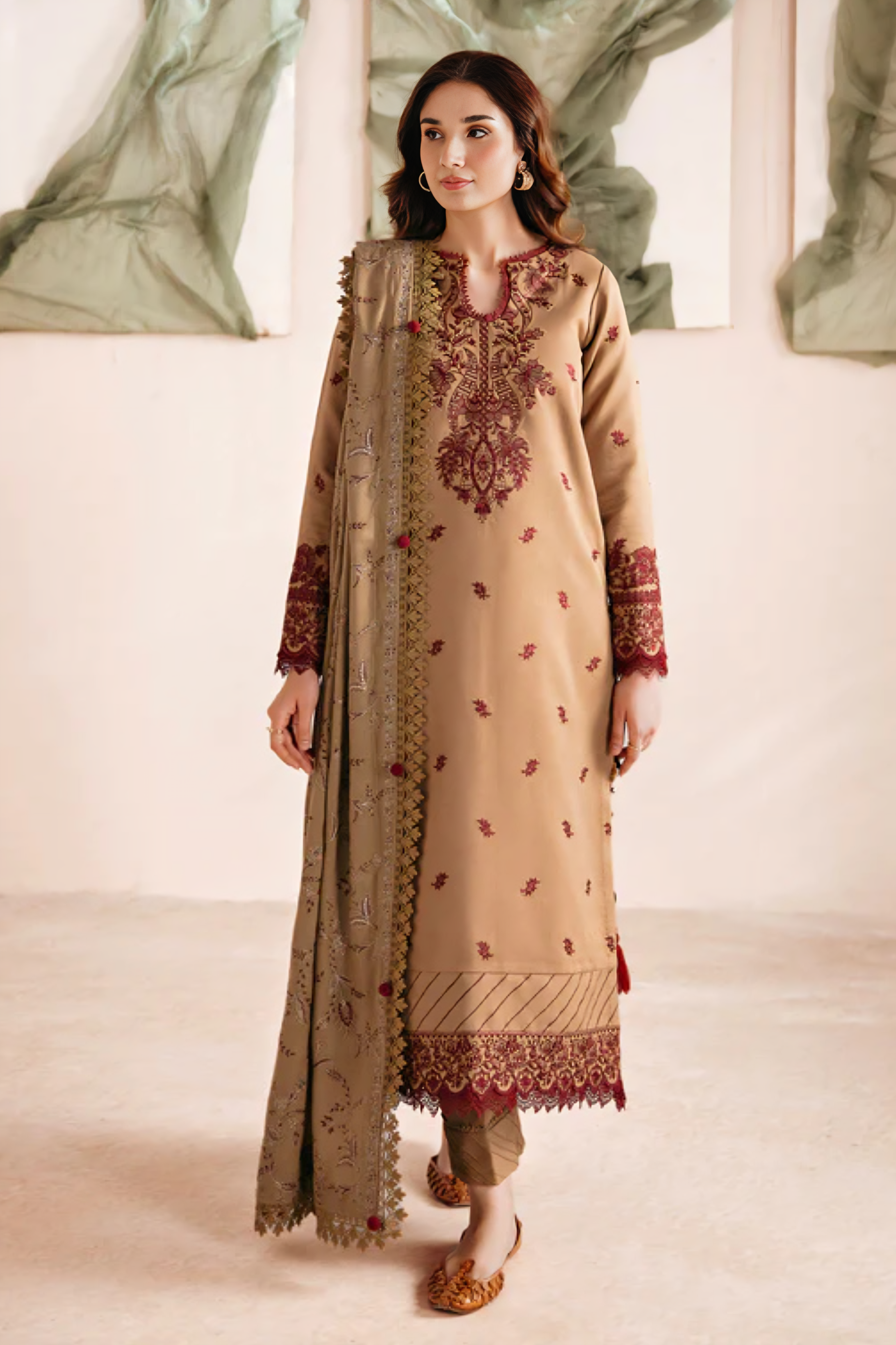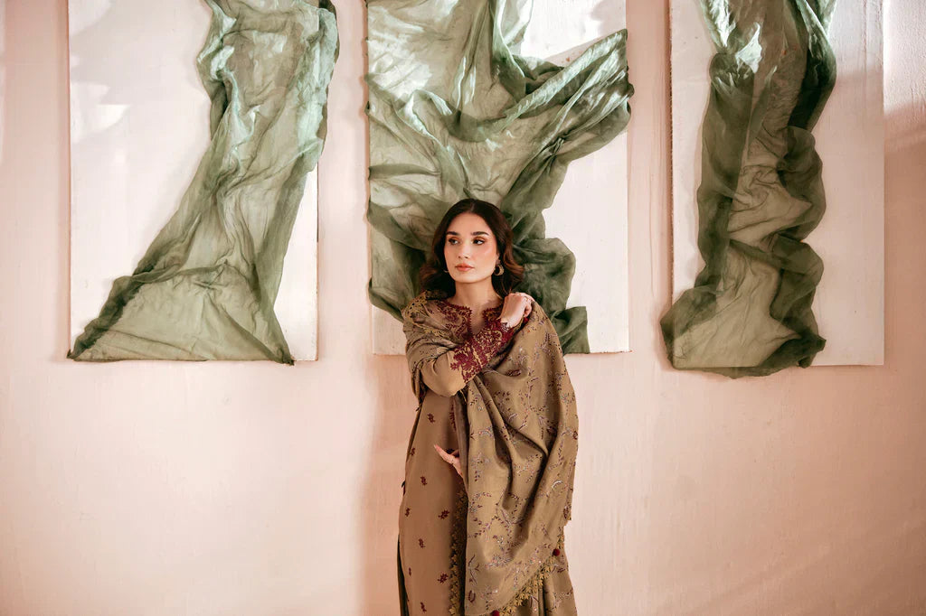 FLORENT - 3PC DHANAK EMBROIDERED SHIRT WITH DHANAK EMBROIDERED SHAWL AND TROUSER - HZG2007