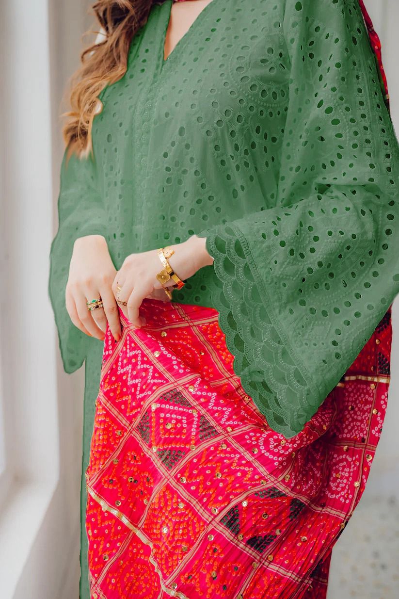 MARIA B - 3PC LAWN CHIKANKAARI EMBROIDERED SHIRT WITH CHUNRI PRINTED DUPATTA AND TROUSER - HZG2125