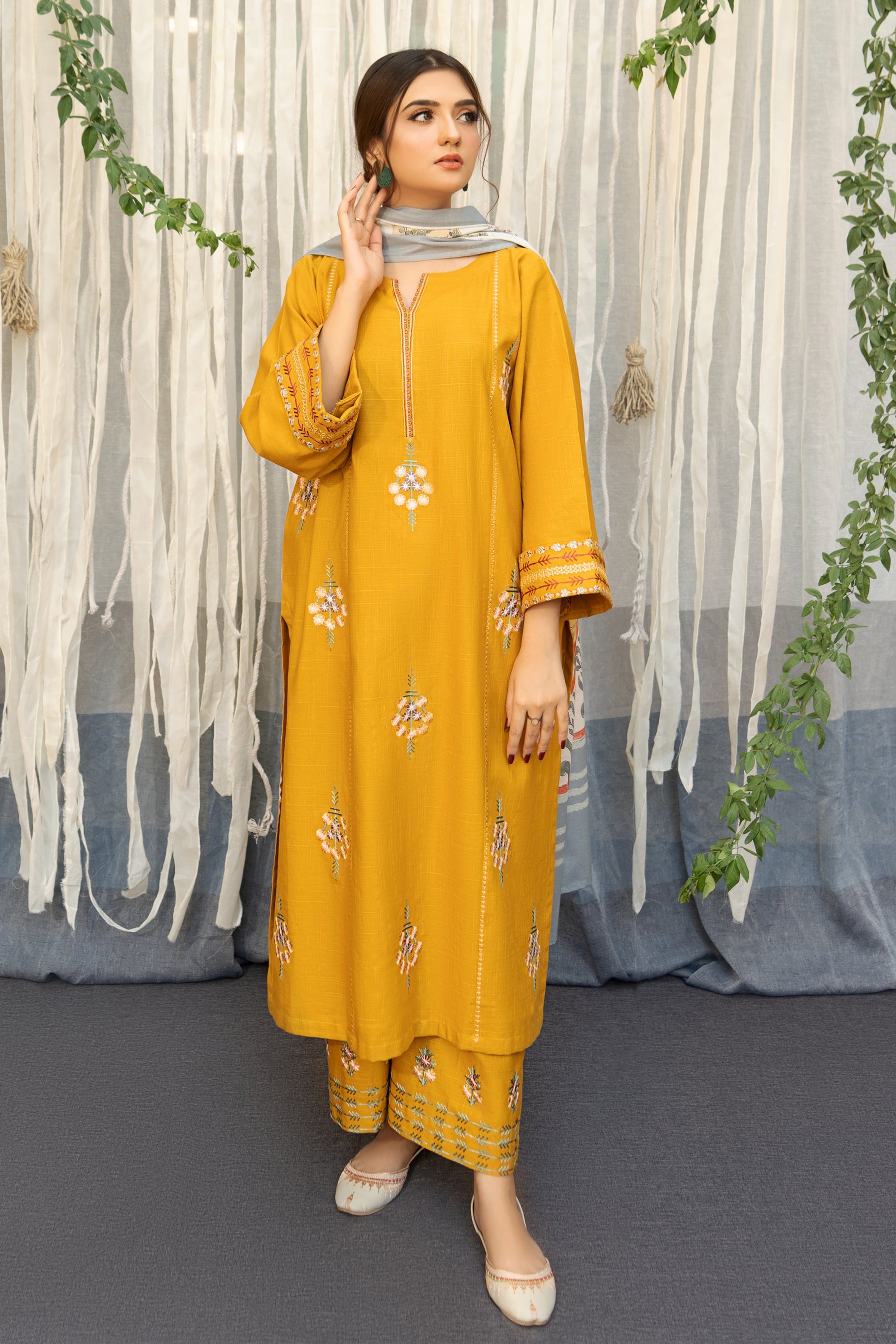 URGE - 3PC DHANAK EMBROIDERED SHIRT WITH PASHMINA WOOL PRINTED SHAWL AND TROUSER - HZG1415